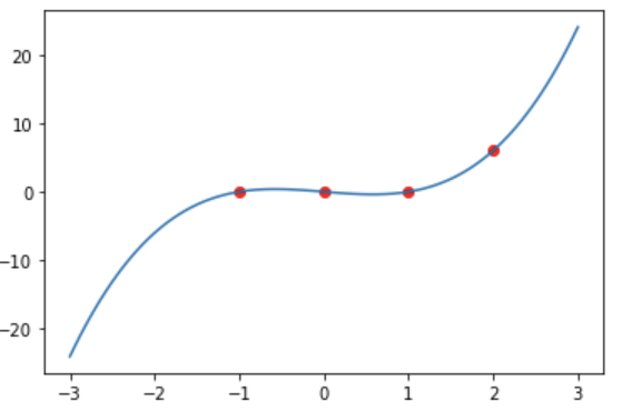 \[(-1, 0), (0, 0), (1, 0), (2, 6)\]위 점을 지나는 함수는 아래와 같다.