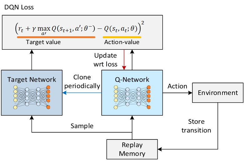 - Target Network: Target network는 target Q-value를 계산하기 위한 neural network이다. Target network는 fixed interval로 Q-network의 parameter를 복사하여 업데이트한다. 이는 학습 중 target Q-value를 고정시킴으로써 학습을 안정화시킨다.