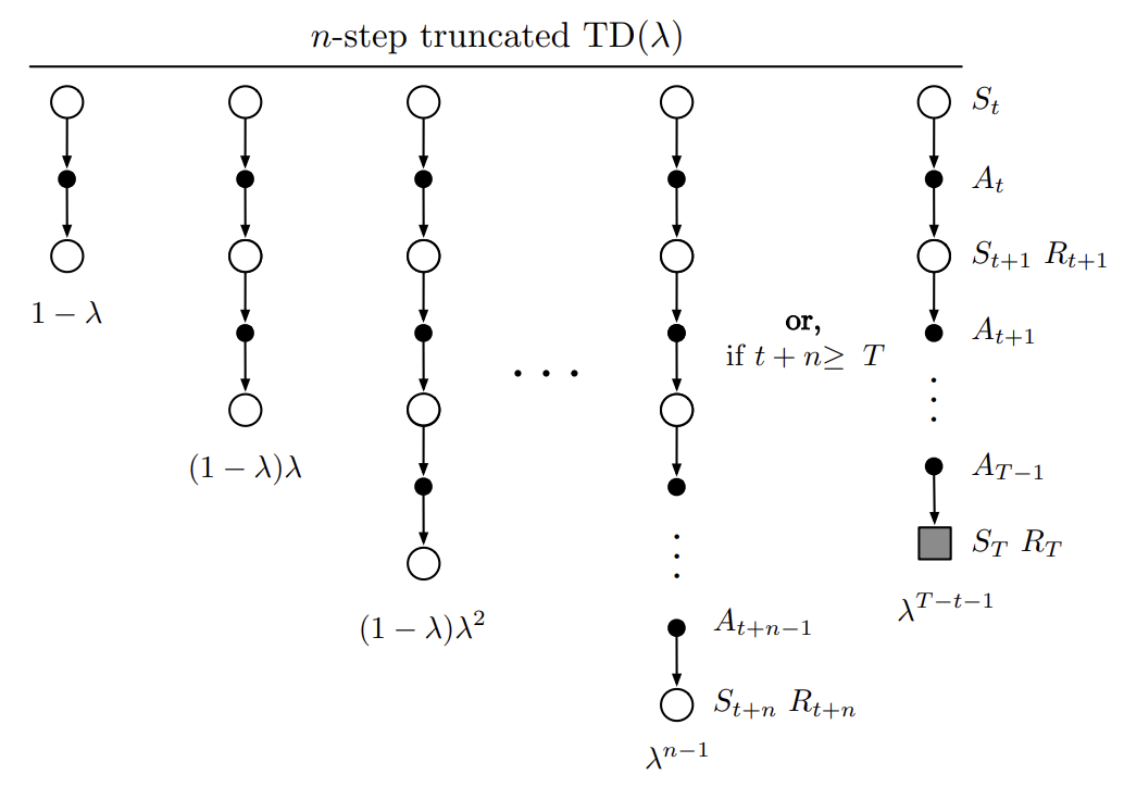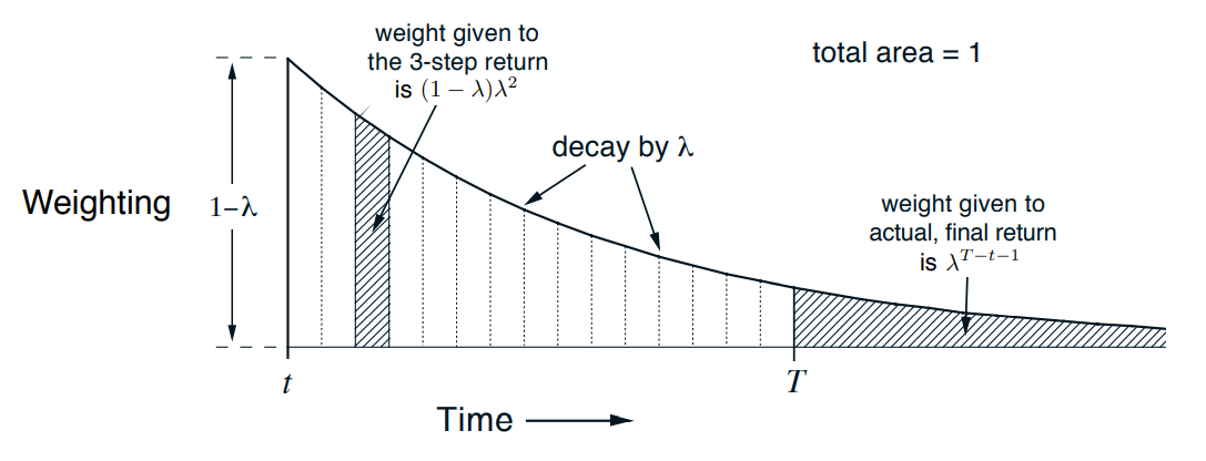 - $\lambda$-return은 $n$-step return의 모든 $n$에 대한 평균으로 더 일반화된 형식