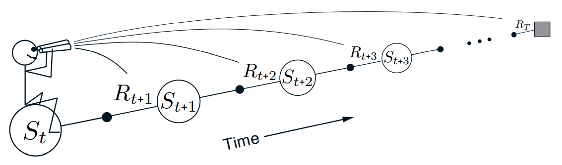 우리가 지금까지 알아본 방법은 forward view이다. time step $t$에서 어떤 state $S_t$를 update할 때 우리는 $t+1, t+2, \dots$와 같이 미래의 보상과 state를 본다. 이 state를 업데이트한 후 다음 state로 넘어가면, 우리는 이전 state를 결코 다시 보지 않는다. 반대로 미래의 것들은 반복적으로 처리된다. 아래는 이러한 forward view의 관계를 나타내는 그림이다.