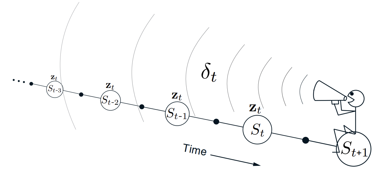 TD($\lambda$)는 시간을 거꾸로 향한다. $\lambda$에 의해 현재 time step으로부터 시간적으로 더 멀리 떨어진 이전 state일 수록 더 적게 update된다. 더 멀리 떨어질 수록 더 많이 discount되기 때문이다. 즉, 더 이전의 state에게 TD error에 대한 더 낮은 신용을 준다. 아래는 이에 대한 그림이다.