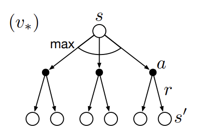 Bellman optimality equation은 Bellman expectation equation과 비슷하나 value들에 대한 expectation이 아닌 maximum value만을 고려한다는 차이가 있다. 아래는 optimal state-value function $v_\ast$에 대한 backup diagram이다.