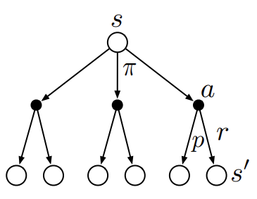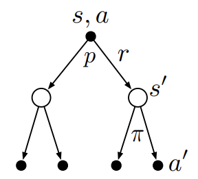 \[q_\pi(s, a) \doteq \mathbb{E}_\pi[R_{t+1} + \gamma q_\pi(S_{t+1}, A_{t+1}) \ \vert \ S_t = s, A_t = a]\]$v_\pi$에 대한 Bellman expectation equation을 아래와 같은 backup diagram으로 나타낼 수 있다. 참고로 backup diagram인 이유는 후속 states에서의 value로부터 역으로 현재 state에서의 value를 구하는 backup operation 관계를 표현하고 있기 때문이다.