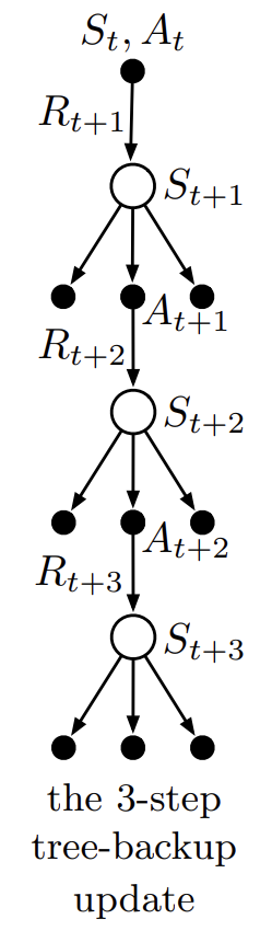 \[G_{t:t+1} \doteq R_{t+1} + \gamma \sum_a \pi(a \vert S_{t+1})Q_t(S_{t+1}, a), \quad t < T-1\]2-step tree-backup return은 아래와 같이 정의된다.