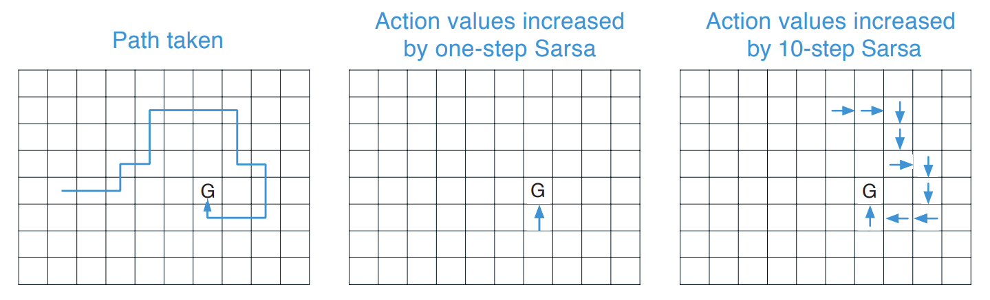위 그림을 보면 알 수 있지만 목표 G에 도달했을 때 1-step Sarsa는 바로 직전 state에서의 action value만 증가하지만 $n$-step Sarsa는 sequence의 마지막 $n$개의 action만큼 증가한다. 이로 인해 하나의 episode로부터 더 많은 학습이 가능해진다.