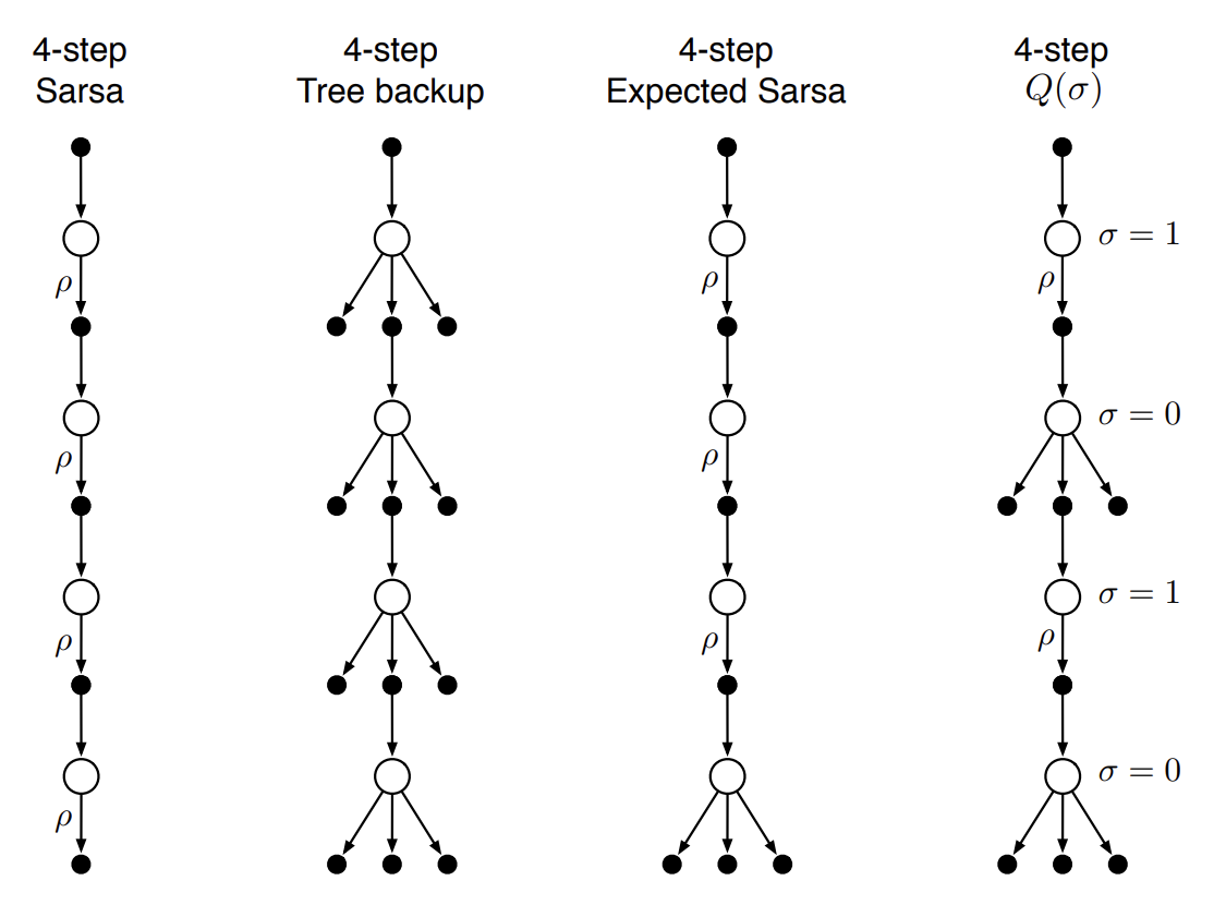 지금까지 아래 3개의 backup diagram이 나타내는 방법을 알아봤었다. 4번째 알고리즘 $n$-step $Q(\sigma)$는 이러한 알고리즘들을 통합한 방법이다.