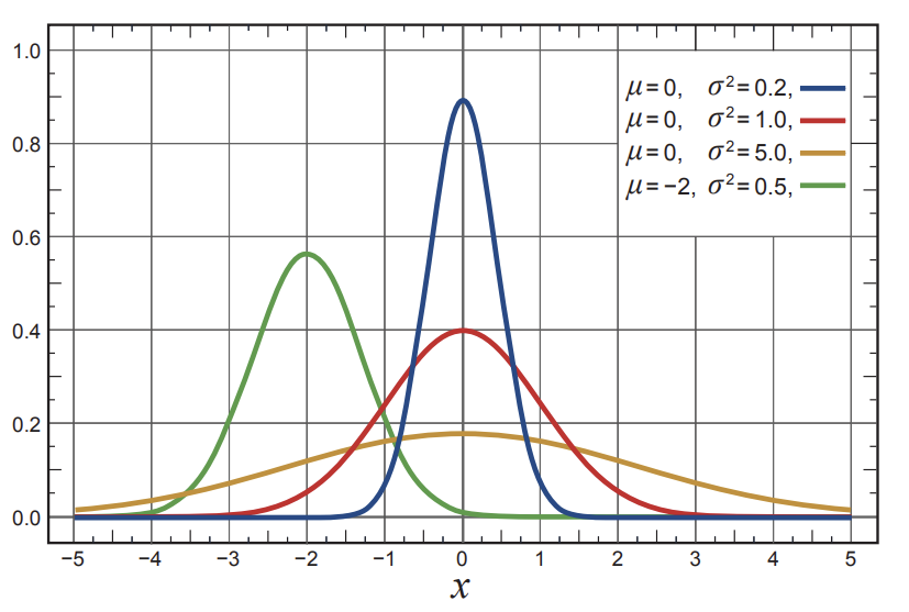 \[p(x) \doteq \dfrac{1}{\sigma \sqrt{2\pi}} \exp \bigg(- \dfrac{(x - \mu)^2}{2 \sigma^2} \bigg)\]$\mu$는 평균, $\sigma$는 표준편차이며, 여기서 $\pi$는 당연하지만 실수 $\pi \approx 3.14159$이다. $p(x)$는 확률이 아닌 $x$에서의 확률밀도이며, $x$가 어떤 범위 안에 있을 확률은 확률밀도함수의 integral이다. 아래 그림은 $\mu$와 $\sigma$의 값에 따른 정규분포 확률밀도함수이다.