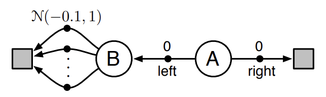 agent는 항상 state A에서 시작한다. A에서 right action을 선택하면 reward 0과 함께 즉시 episode는 종료된다. left action을 선택하면 reward 0과 함께 state B로 전이된다. state B에서는 episode를 즉시 종료할 수 있는 수 많은 action들이 존재한다. 이 때 각 action들을 선택함으로써 얻게 되는 reward는 normal distribution $N(-0.1,1)$을 따른다. 즉, stochastic한 environment이다.