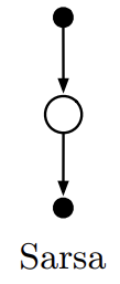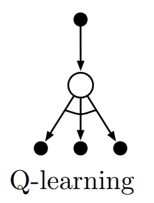 \[Q(S_t, A_t) \leftarrow Q(S_t, A_t) + \alpha \Big[R_{t+1} + \gamma \max_a Q(S_{t+1},a) - Q(S_t,A_t) \Big]\]Q-learning과 Sarsa의 가장 주요한 차이는 TD error를 구성할 때 next state-action pair의 value function $Q$를 선택하는 기준이다. Sarsa는 next state $S_{t+1}$에서 현재 policy $\pi$를 따라 action value를 선택했다면, Q-learning은 현재 policy와 상관 없이 next state에서의 maximum action value $\max_a Q(S_{t+1},a)$를 선택한다. Q-learning의 backup diagram은 아래와 같으며 Sarsa의 backup diagram과 비교해보길 바란다.