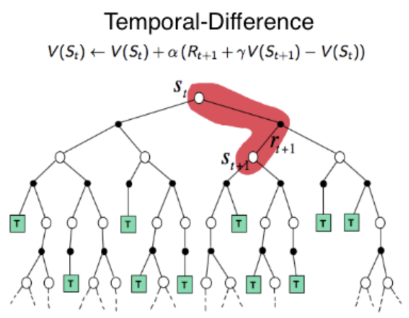 backup diagram의 맨 위 state node에 대한 value 추정치는 next state로의 딱 1번의 sample transition을 통해 즉각적으로 update된다.
